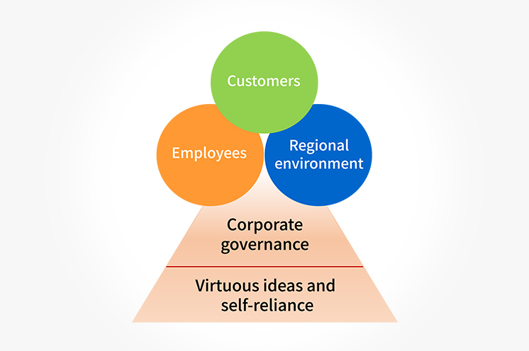 As a general merchandise store with strong ties to the local community, we aim to be a company that shares in happiness and is genuinely trusted in society by bringing joy to our customers, letting our employees shine, and growing together with the community.