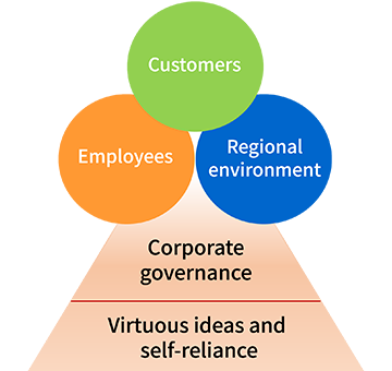 Based on our corporate philosophy of “virtuous ideas” and “self-reliance,” we will aim to meet the wide-ranging needs of society and our customers and be a company that shares in happiness and is genuinely trusted in society by bringing joy to our customers, letting our employees shine, and growing together with the community.