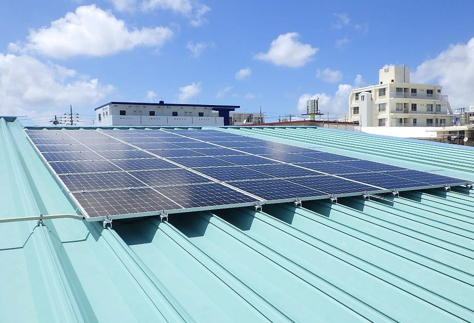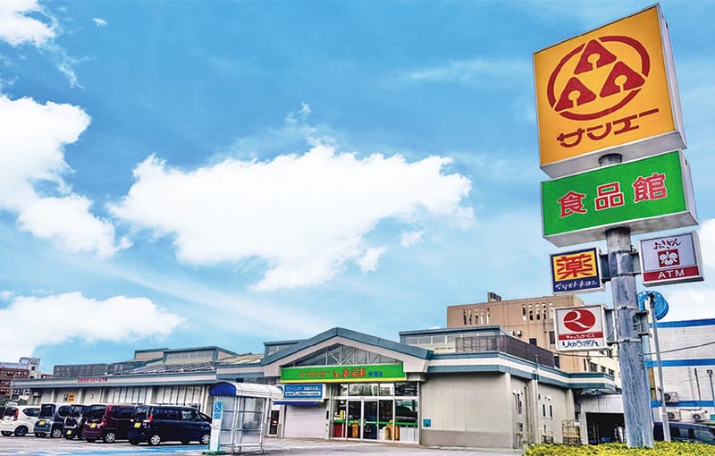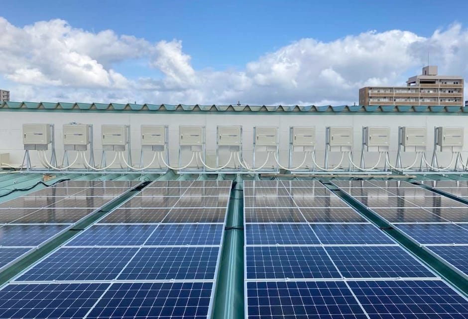 SAN-A grocery store V21 Makiminato has improved energy efficiency by generating and using renewable energy on-site, while minimizing consumption through the adoption of high-efficiency air-conditioning equipment along with the installation of solar power generation equipment.