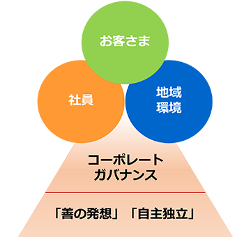 当社は、「善の発想」と「自主独立」の企業理念のもと、社会やお客さまの多様なニーズに対応し、「お客さまが喜び、社員が輝き、地域と共に会社も成長する」幸せを共感し、真に信頼される企業を目指してまいります。