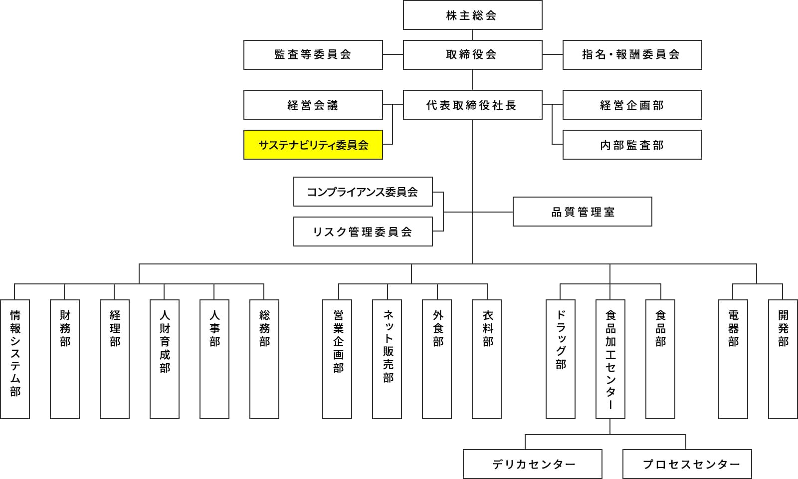 当社では、2022年4月に代表取締役社長を委員長とし、経営会議メンバー(業務執行取締役、常勤監査等委員、各部長、子会社の取締役社長)で構成するサステナビリティ委員会を設置いたしました。実行項目の立案・推進、前期実行計画の評価を行い、委員会の審議内容については定期的に取締役会へ報告・提言を行っており、必要に応じてリスク管理委員会へ報告いたします。